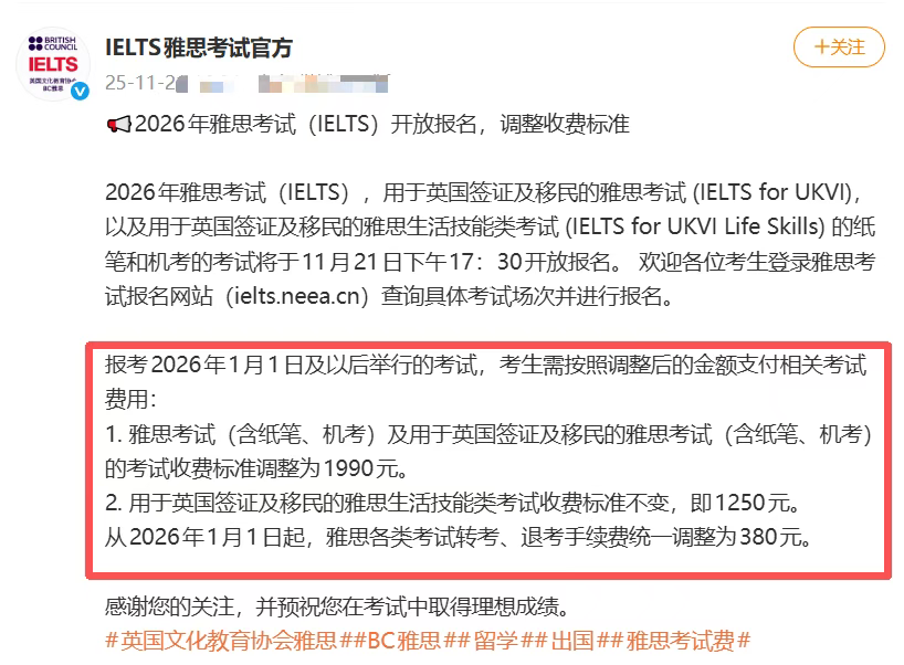 近日,英國文化教育協會(BC雅思)傳來重磅消息:自2026年1月1日起,雅思紙筆和機考,以及UKVI紙筆和機考的費用將調整為1990元,較之前下調近200元。同時,轉考、退考的手續費也統一降至380元,降價40元。這一波降價操作,對于廣大“屠鴨黨”來說,無疑是個振奮人心的好消息。