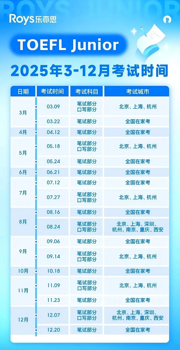 2025年下半年小托福考試時間如下(具體時間還是得以官網(wǎng)和考試中心的通知為準哈):