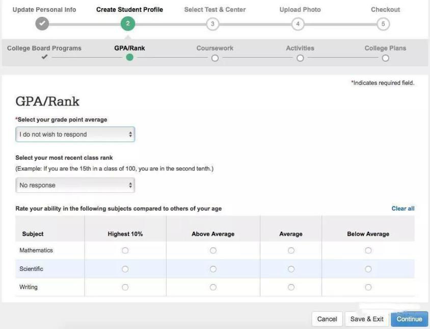 (二)、Create student Profile:有5項個人情況調查,都是調查類問題,非*號可以不用填。按步驟選擇即可,然后點擊最下方藍色continue。