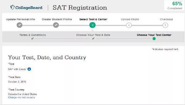 (三)、Select Test &Center:選擇考試及考場信息。首先如果不是在美國考試就勾選‘Outside the United States’選項;考試類型分為SAT和SAT subject tests(就是SAT;然后選擇考試時間;后面是殘疾人考生設置的,一般孩子選no;再后面兩個選項都可選no);然后選考場(注意中國大陸沒有考點,不要選China選項),點‘select’選擇考場;最后確認考場信息,選擇‘continue’;