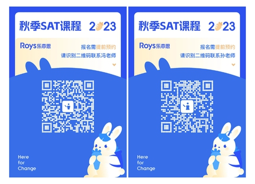 以上就是樂亦思秋季SAT的課程設置了,歡迎大家來預約校長做規劃,樂亦思高管老師將為每一位同學提供專屬的“一人一例”學習方案。感興趣的家長同學們可以聯系樂亦思的在線客服或者掃描下方的二維碼哦~