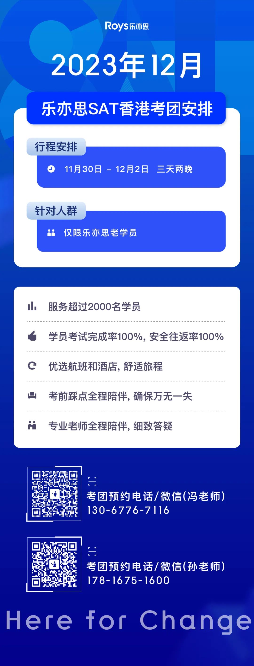 此次考團仍將由樂亦思創始人Roy老師親自帶隊, 為各位參加12月2日SAT考試的老學員提供全程送考服務。