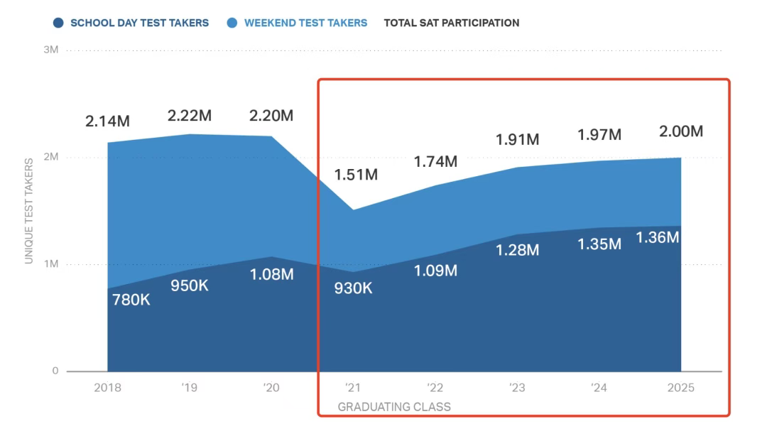 從2021年開始,SAT考生人數(shù)就連年攀升。到了2025屆,考生總數(shù)已經(jīng)達到了2,004,965人,比2023屆多了近10萬!特別是亞裔考生,增長更是驚人,從2023年的19.4萬漲到了2025年的21.7萬,三年間增長了12%!