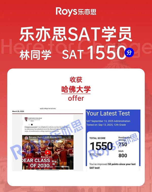 林同學,作為樂亦思SAT暑假全程C班的一員,這次放榜中成功被哈佛大學錄取,真是可喜可賀!林同學的媽媽第一時間與我們分享了這份喜悅:“在孩子最關鍵的時候,樂亦思的老師們手把手地傳授知識,不斷地鼓勵她,這對孩子的影響非常深遠。這份成績,也是樂亦思的驕傲!”