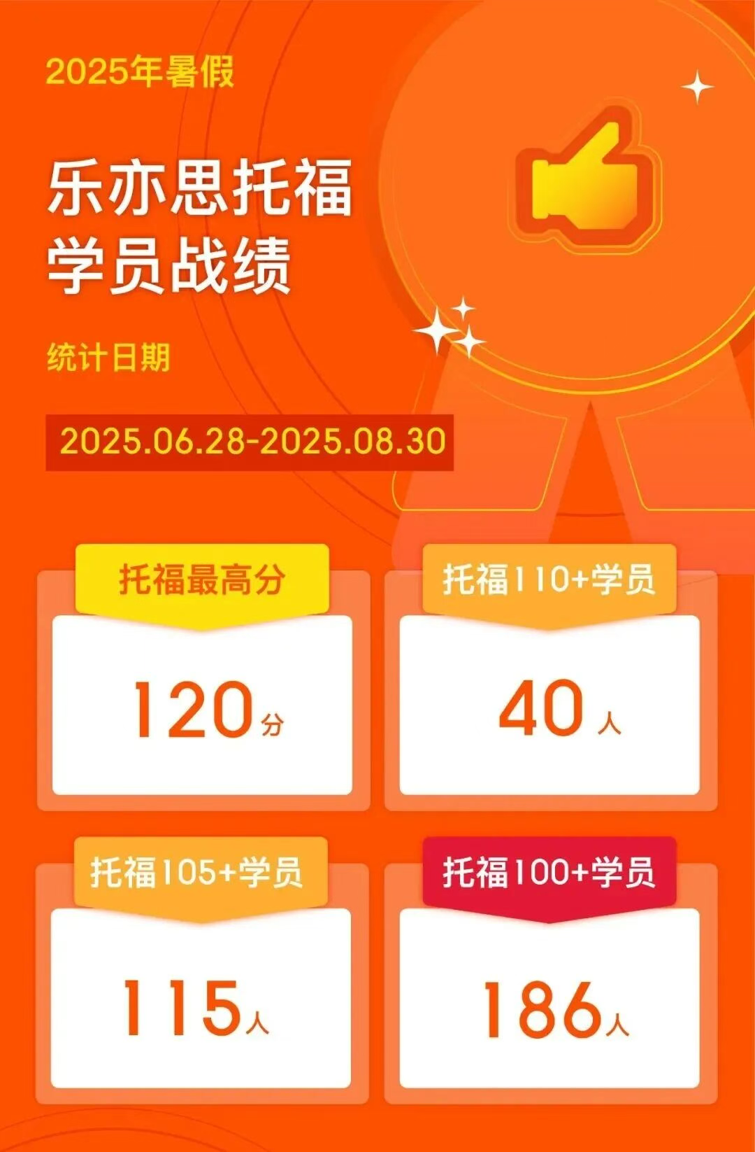 這個暑假,樂亦思托福的高分陣營實現了“質”的飛躍!短短兩個月內,竟有186位學員斬獲托福100+的超高分,其中40位更是沖上了托福110+的巔峰,最高分直逼120分!