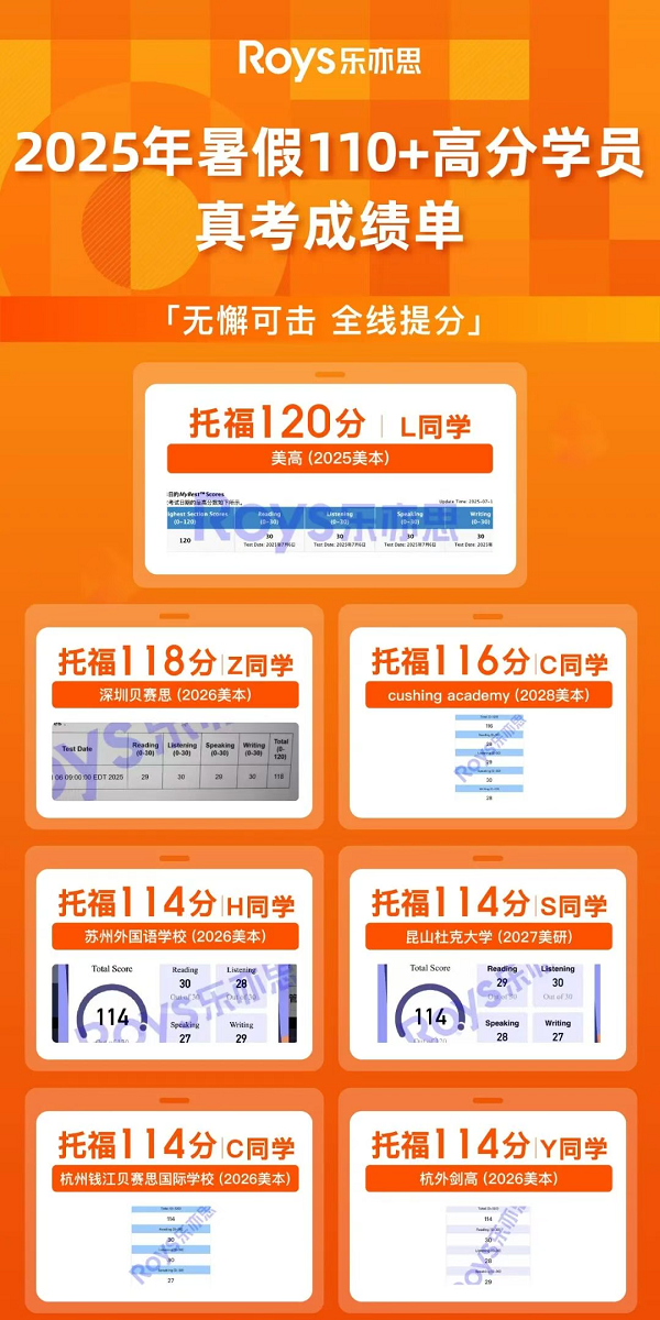 同學們能穩居110+的高地,絕非偶然。無論是要求絕對精準的閱讀聽力滿分,還是考驗思維深度的口語25+與寫作27+,任何一個短板都可能讓他們與高分失之交臂。正是這種無短板的全面能力,構成了他們斬獲超高分的嚴密閉環。也正是單項分點滴積累的進步,換來了總分的飛躍!
