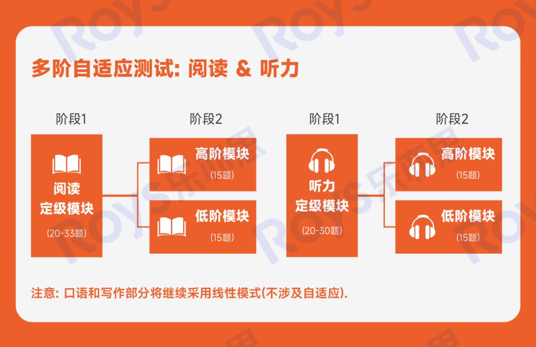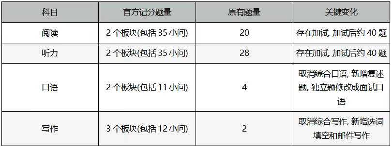 這種自適應機制對考生的首輪答題穩定性提出了更高要求,但同時也優化了考試體驗,避免了考生在某一題上耗時過長。此外,四個單項的題量也有所調整,閱讀和聽力各35題,寫作12題,口語11題。