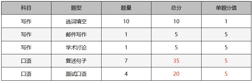 最后,是大家最為關心的分值規則與分數換算問題。閱讀和聽力共35題,對應原始分35分;口語55分,寫作20分。不同題型的分值有所差異,新題型與傳統題型的分值也不盡相同。最終,四科原始分將統一轉換為6分制,分數區間為1-6分,無0分。得到6分制的分數后,再計算四科的平均分,即為考生的最終成績。