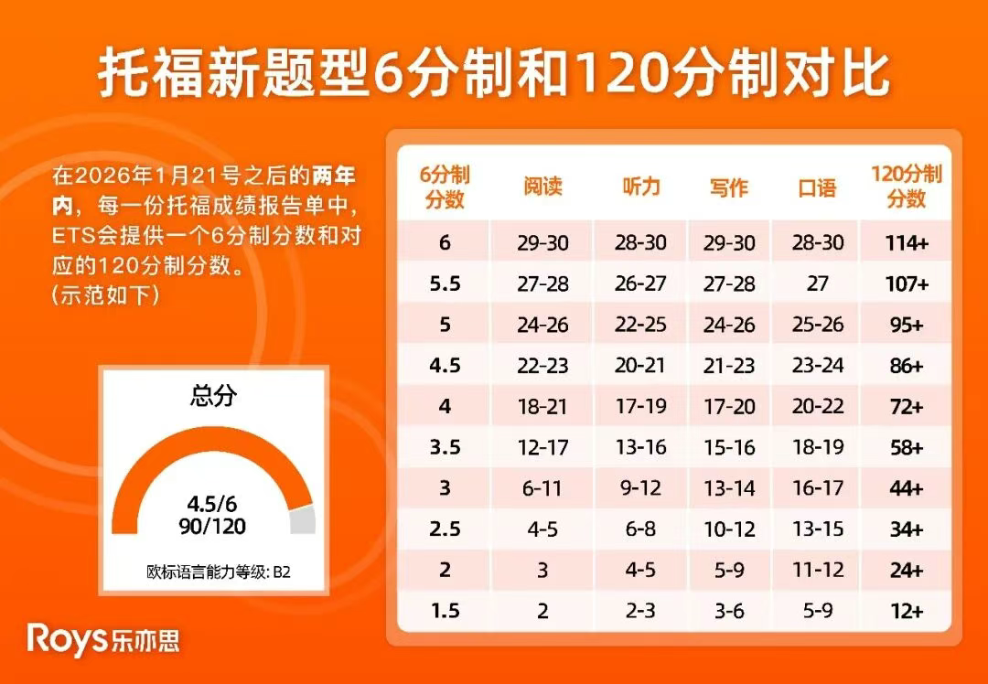 對比發(fā)現(xiàn),除俄亥俄州立大學(xué)外,其余三所對新托福分?jǐn)?shù)要求多為5分(康奈爾推薦5.5分,NYU要求單項(xiàng)分?jǐn)?shù)達(dá)5分)。對標(biāo)托福官方6分制分?jǐn)?shù)換算表,能發(fā)現(xiàn)不少院校通過調(diào)整分?jǐn)?shù)線降低了實(shí)際要求,如康奈爾大學(xué)從110分變?yōu)?07分,俄亥俄州立大學(xué)從79分變?yōu)?4分。換算成0 - 120分制,5分對應(yīng)95 +,5.5分對應(yīng)107 +,6分滿分對應(yīng)114 +。可見,2026年起新托福有望成為簡單且認(rèn)可度高的考試,值得考生選擇。