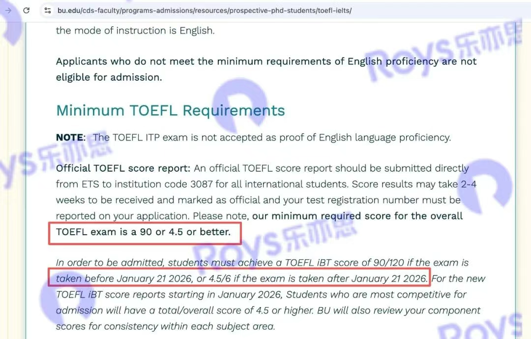 波士頓大學(xué)2026年1月前參加的托福考試,最低90分;2026年1月或之后參加的,新托福最低要求為4.5分。