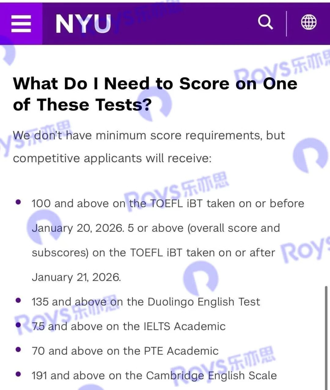 紐約大學(xué)則要求,2026年1月20日之前參加的托福考試,成績需在100分以上;2026年1月21日之后參加的,新托福最低要求為5分及以上。